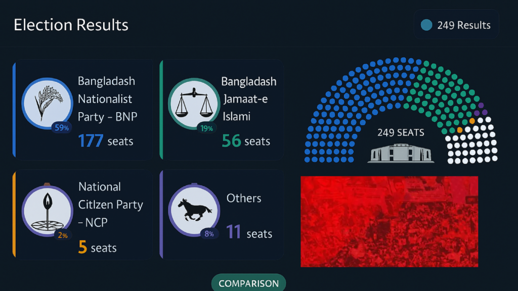 Unofficial tallies show BNP winning 182 seats, representing 61% of the 300-member Jatiya Sangsad. This gives the party a clear majority, enabling it to govern without coalition dependency. Bangladesh Jamaat-e-Islami followed with 56 seats (19%), while the National Citizen Party (NCP) gained 4 seats (1%). Other smaller parties and independents collectively secured 11 seats (8%).